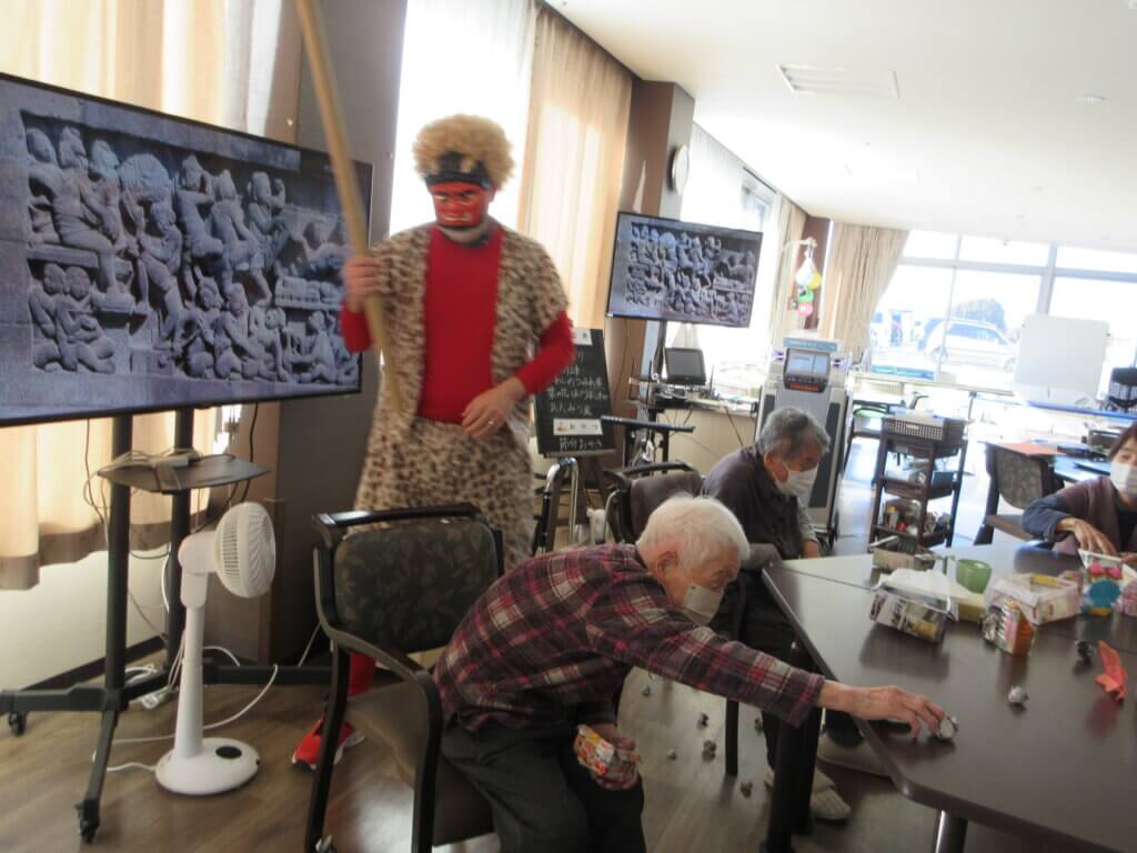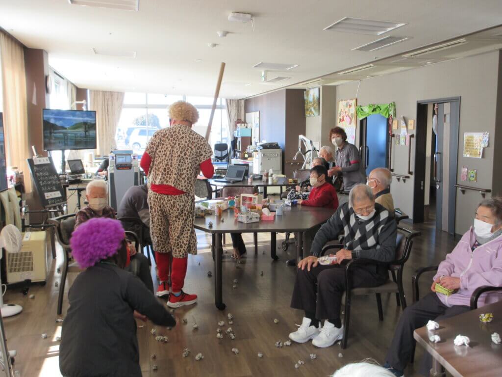 【DS】鬼はそと~♪2月 8, 2026 | グリーンライフ・ネクステ2026年2月3日『節分』今年も鬼がやってきました。皆さん、童心に帰ったように、鬼に向かって沢山マメを投げていました。中には「こわい~」と、反応される方もいらっしゃいましたが、顔は笑顔で、楽しんでいただけたようでした。今年一年、皆さん健康でありますように、と鬼は帰っていきましたとさ。 #前の記事へ 次の記事へ$ 関連記事 【DS】3月🌸 【DS】🌸お花見🌸 【拠点】【DS】節分行事食👹 風呂の日 【拠点】非常発電機設置に伴う「停電」について 初詣【DS】