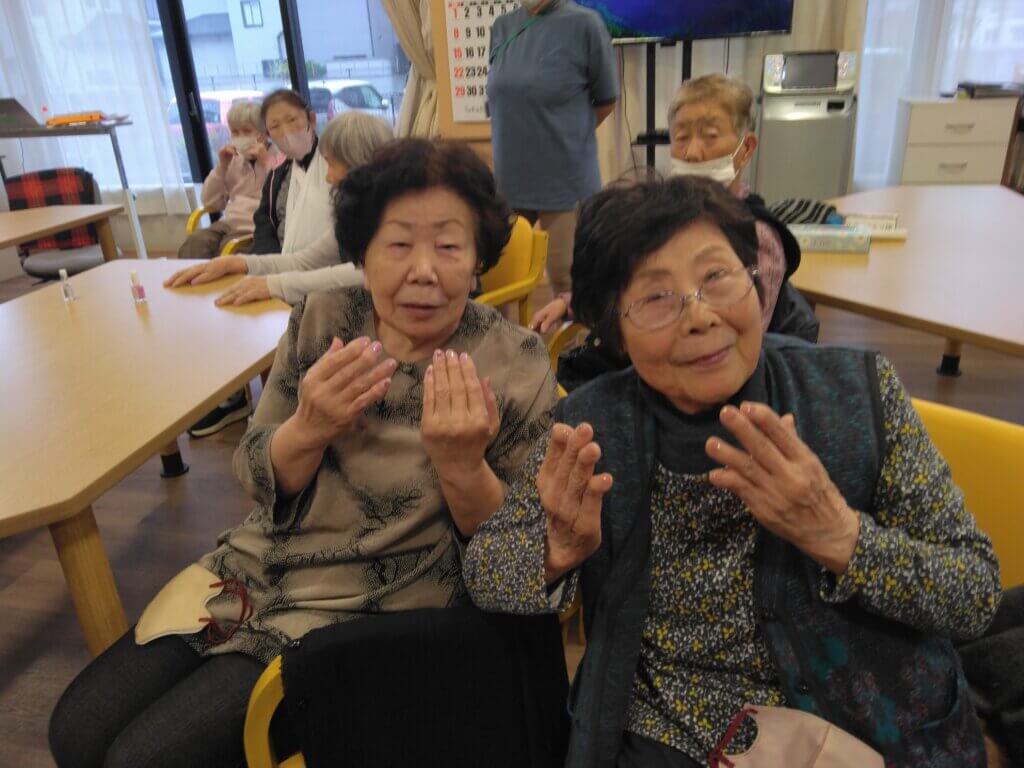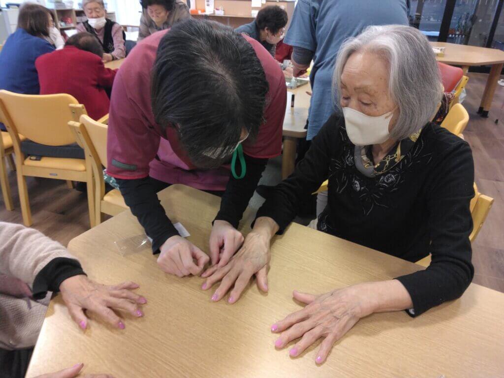 〔デイサービス〕ネイルサロン4月 3, 2026 | アーバンライフ・ネクステ令和8年3月31日、本日はネイルサロンのレクリエーションを行いました。皆様好きな色のネイルを塗られています。綺麗なネイルとパシャリ #前の記事へ 次の記事へ$ 関連記事 〔デイサービス〕桜満開 お花見御前 【デイサービス】お芋の食べ比べ 【SS】ラーメンレク 【DS&SS】 ひな祭り 【特養】フルート演奏会