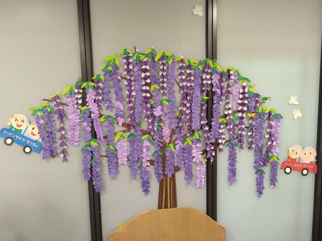 〔デイサービス〕満開!藤の花4月 28, 2026 | アーバンライフ・ネクステデイサービスのフロアに満開の藤の花が咲きました。ご協力して頂いた利用者様のおかげでとても綺麗に咲きました。 #前の記事へ 関連記事 【SS】 〔デイサービス〕桜満開 お花見御前 〔デイサービス〕ネイルサロン 【デイサービス】お芋の食べ比べ 【SS】ラーメンレク 【DS&SS】