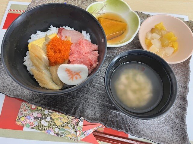 新年会のお食事は、海鮮丼をおいしくいただきました。